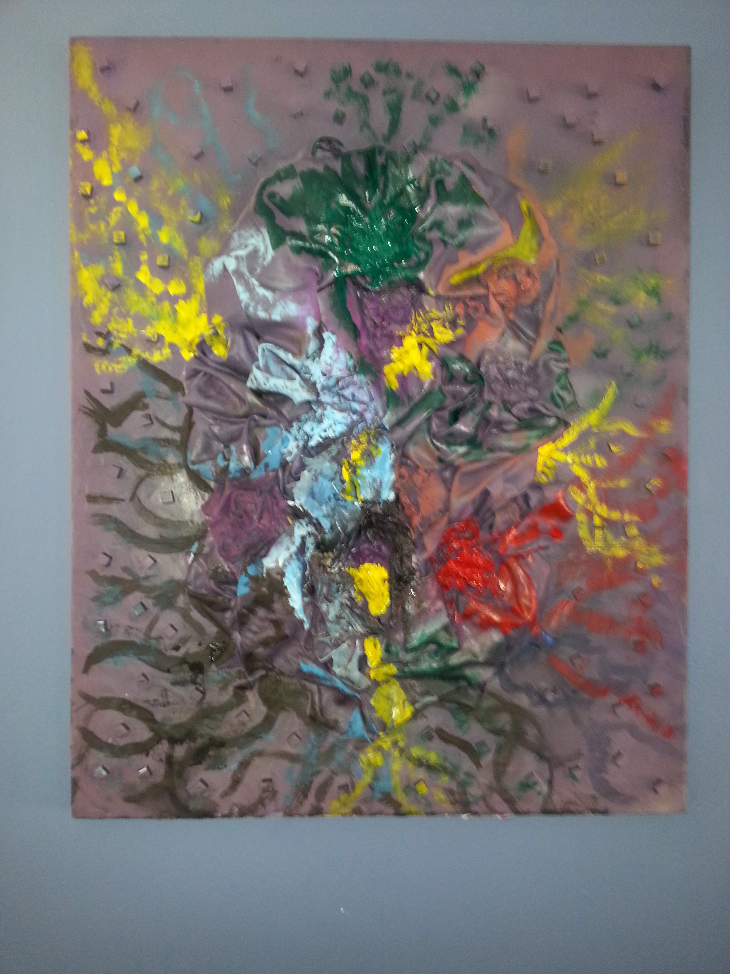 Acrylic painting and Oils on Canvas, along with rags and some fabric sets an interesting conversation piece.