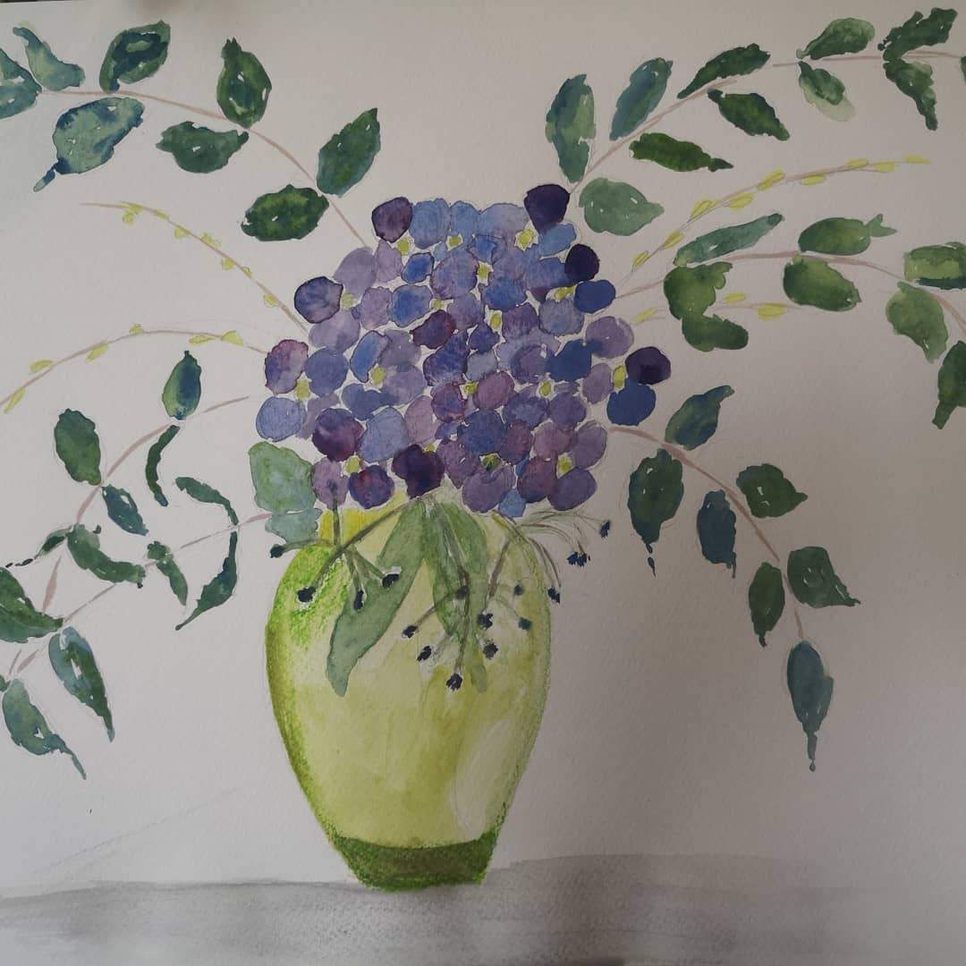 Vase with Hydrangea and Eucalyptus. afternoon study