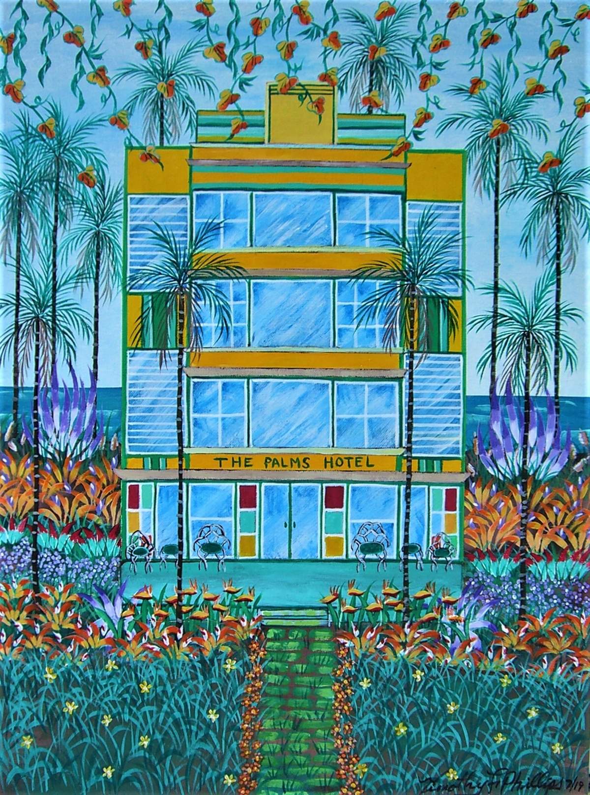 This is a tropical theme based painting of a famous hote in keywest florida It is done with brilliant and bold colors. It is done with fine details. This is an original work of art.