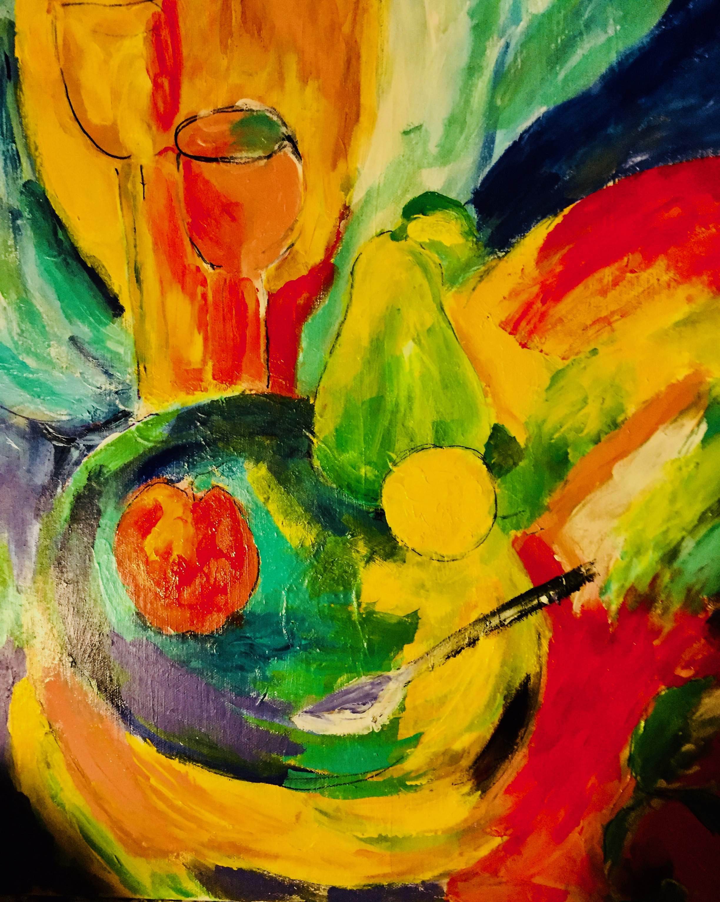 Abstract still life with fruit in bright colors. This is original artwork with acrylic. The size is 20 x 20