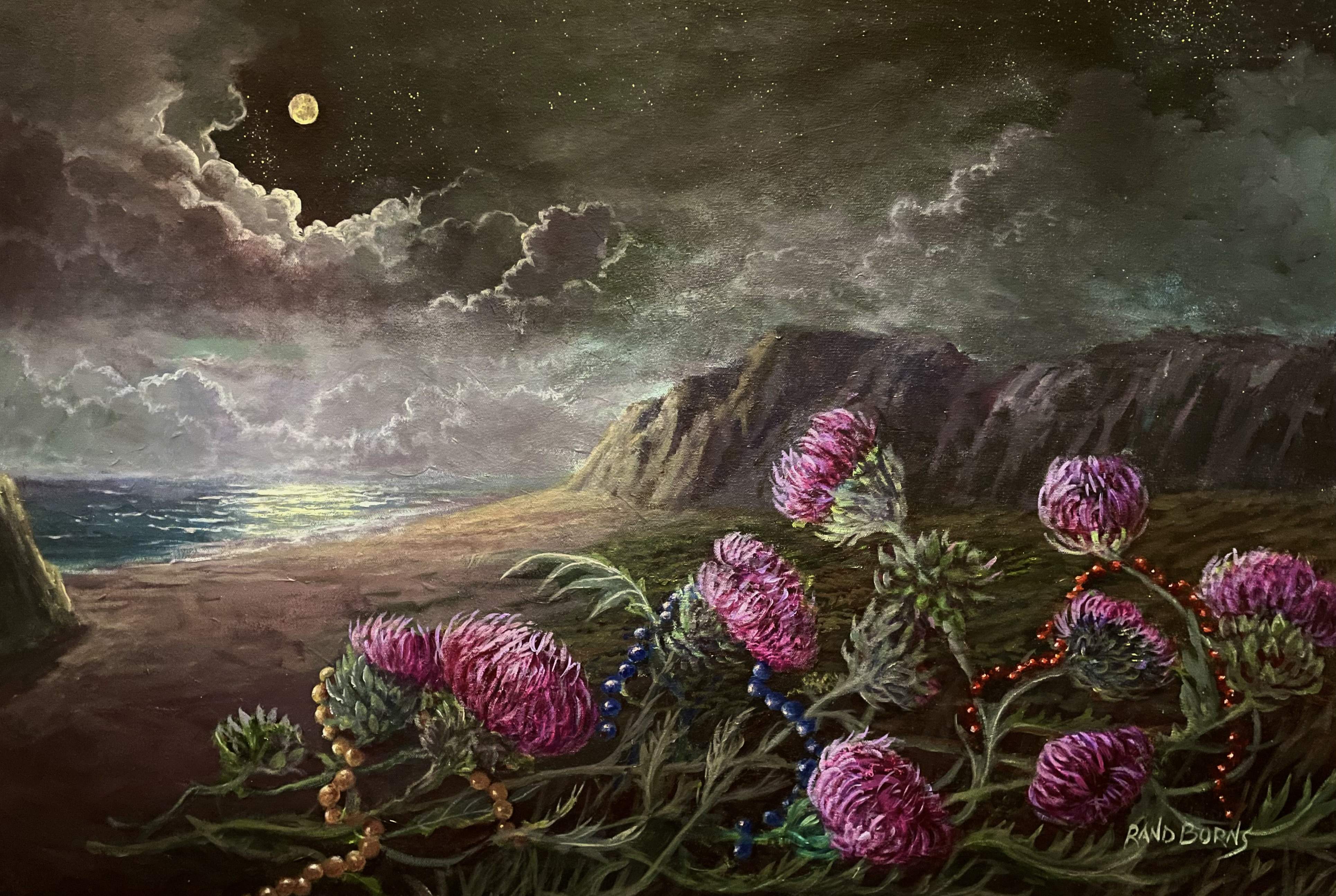 ***SOLD TODAY ON 9/7/2021 TO A COLLECTOR IN LONG BEACH, CALIFORNIA.*** Cascading over fallen thistles, colorful beads glisten underneath the moonlight. Hints of romance, carefree moments of love and nostalgic interludes fill the atmosphere.